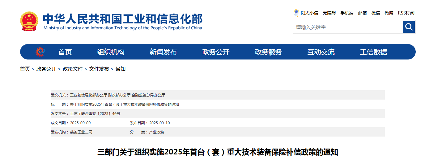 三部门联合发布《关于组织实施2025年首台(套)重大技术装备保险补偿政策的通知》