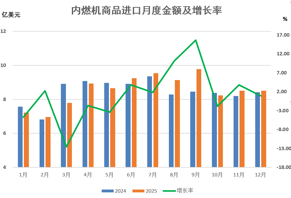 进口总额104.10亿美元,同比增长2.74%。细分品类中,柴油机、其它类用内燃机、发电机组同比增长,其余各类下降(汽油机降幅较大):