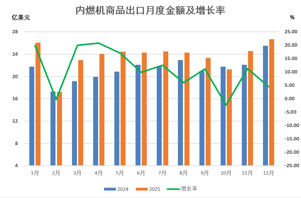 聚焦内燃机行业,2025年进出口总额达387.42亿美元,同比增长8.38%。其中进口104.10亿美元(+2.74%),出口283.32亿美元(+10.61%),贸易顺差179.22亿美元,进出口均实现同比增长,出口涨幅持续保持10%以上。