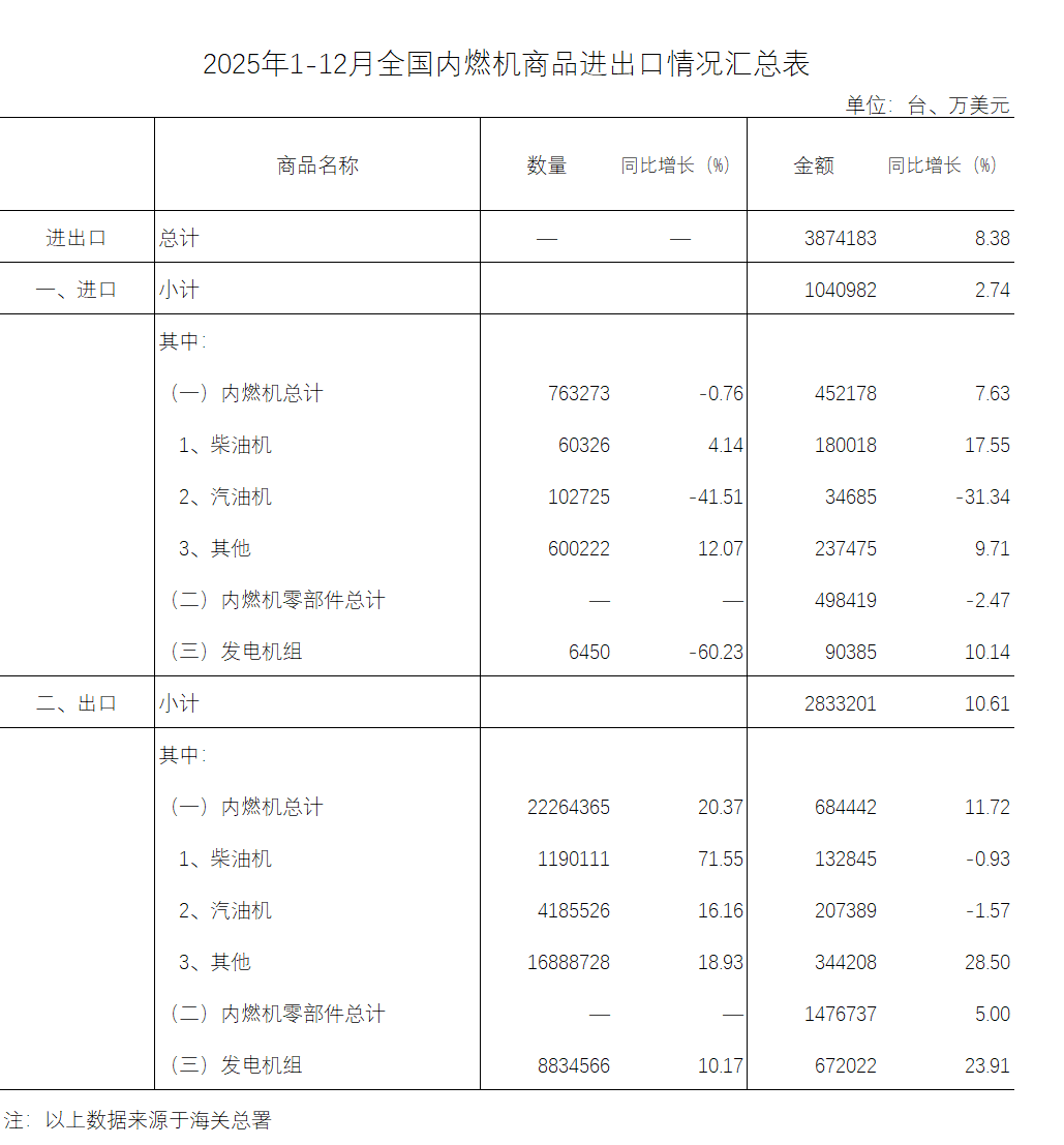 聚焦内燃机行业,2025年进出口总额达387.42亿美元,同比增长8.38%。其中进口104.10亿美元(+2.74%),出口283.32亿美元(+10.61%),贸易顺差179.22亿美元,进出口均实现同比增长,出口涨幅持续保持10%以上。